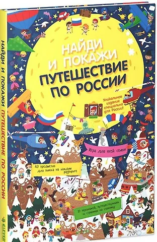 .Открывая новую книгу НАЙДИ И ПОКАЖИ. ПУТЕШЕСТВИЕ ПО РОССИИ - вы попадаете в захватывающее путешествие по нашей стране. Перелистывая страницу за страницей, не выходя из дома, вы побываете в таких знаковых местах нашей родины как Кремль и Красная площадь, в самом красивом в мире московском метро, в легендарном Парке Горького, посетите Олимпийские игры в Сочи, Петергоф, русскую деревню и даже Сибирь! А в этом незабываемом приключении к вам присоединятся великие русские писатели, знакомые каждому с детства: А.С.Пушкин, А.С.Грибоедов, М.Ю.Лермонтов, Л.Н.Толстой, а также литературные и сказочные персонажи, например, Баба-яга, Спящая царевна, Конек-Горбунок, Дед Мороз и