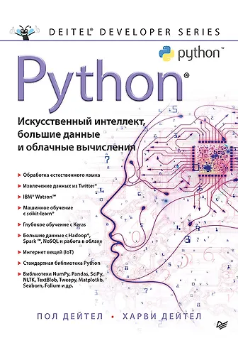 В вашем распоряжении более пятисот реальных задач — от фрагментов до 40 больших сценариев и примеров с полноценной реализацией. IPython с Jupyter Noteboos позволят быстро освоить современные идиомы программирования Python. Главы 1-5 и фрагменты глав 6-7 сделают понятными примеры решения задач искусственного интеллекта из глав 11-16. Вы познакомитесь с обработкой естественного языка, анализом эмоций в Twitter®, когнитивными вычислениями IBM® Watson™, машинным обучением с учителем в задачах классификации и регрессии, машинным обучением без учителя в задачах кластеризации, распознавания образов с глубоким обучением и сверточными нейронными сетями, рекуррентными нейронными сетями, большими данными с Hadoop®, Spark™ и NoSQL, IoT и многим другим. Вы поработаете (напрямую или косвенно) с облачными сервисами, включая Twitter, Google Translate™, IBM Watson, Microsoft® Azure®, OpenMapQuest, PubNub и др.