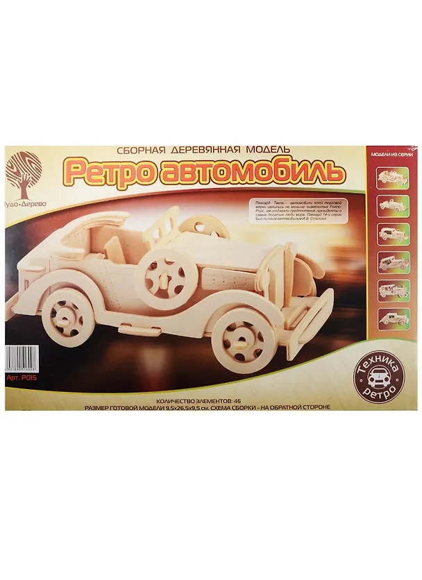 Р015 Сборная деревянная модель Ретро автомобиль Паккард (46 дет.) (9,5х26,5х9,5) (Техника ретро) (Чудо-Дерево) (3+)