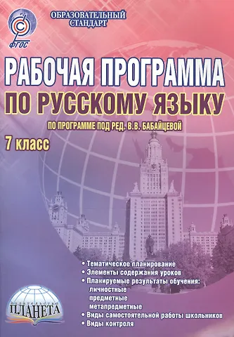 В книге представлена рабочая программа по русскому языку для 7 класса, созданная на основе авторской программы под редакцией В.В. Бабайцевой с учетом линий УМК, вошедших в Федеральный перечень учебников на 2014-2015 учебный год. Рабочая программа составлена с учетом требований Федерального государственного образовательного стандарта второго поколения и Примерной программы основного общего образования по русскому языку. Книга содержит пояснительную записку, подробное календарно-тематическое планированием с указанием темы и типа урока, элементов содержания образования на уроке, планируемых результатов обучения (личностных, предметных, метапредметных), видов самостоятельной работы, направленных