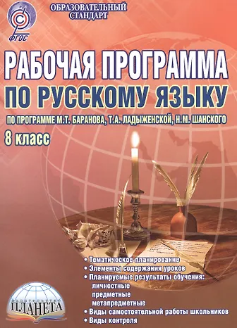 В книге представлена рабочая программа по русскому языку для 8 класса, созданная на основе авторской программы под редакцией М.Т.Баранова, Т.А.Ладыженской, Н.М.Шанского. Рабочая программа составлена с учетом требований Федерального государственного образовательного стандарта второго поколения и Примерной программы основного общего образования по русскому языку. Книга содержит пояснительную записку, подробное календарно-тематическое планированием с указанием темы и типа урока, элементов содержания образования на уроке, планируемых результатов обучения (личностных, предметных, метапред-метных), видов самостоятельной работы, направленных на формирование у обучающихся УУД, а также видов контроля