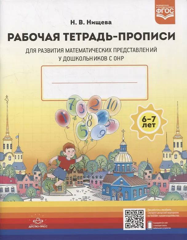 Рабочая тетрадь-прописи входит в методический комплект к пособию Н. В. Нищевой "Развитие математических представлений у дошкольников с ОНР (с 6 до 7 лет)" и содержит игровые задания и упражнения для совершенствования навыков ориентировки на плоскости, на бумаге в клетку, навыков количественного и порядкового счета в пределах десяти, присчитывания двойками и пятками, установления взаимно однозначного соответствия между множествами, формирования умения пользоваться математическими знаками, умения писать цифры и решать примеры, что важно не только для познавательного развития ребенка, но и для подготовки к школьному обучению в целом.