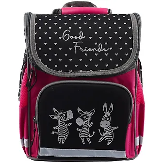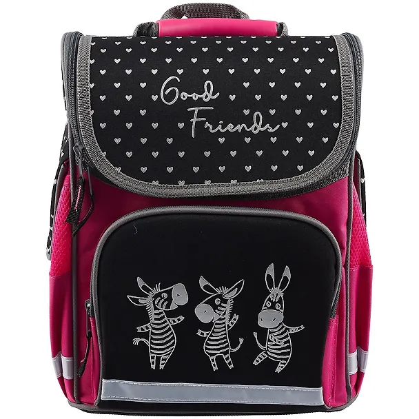 Ранец школьный. ЗЕБРЫ. Размер: 28х34х15 см. Материал: полиэстер. Количество отделений - 1. Внутренняя организация: карман из прозрачного ПВХ, карман на молнии, мягкие разделители. Застёжка - молния. Материал собачки: лента репсовая. Форма собачки: хляст. Количество наружных карманов - 3. Тип спинки - формоустойчивая спинка из сетчатой ткани и поролона. Тип дна - уплотнённое дно. Отделка: высокая печать. Цвет - розовый. Особенности: лямки, регулируемые по длине, светоотражающие элементы. Крепления для канцелярских принадлежностей: нет. Подклада: есть. Индивидуальная упаковка: ПЭТ-пакет.