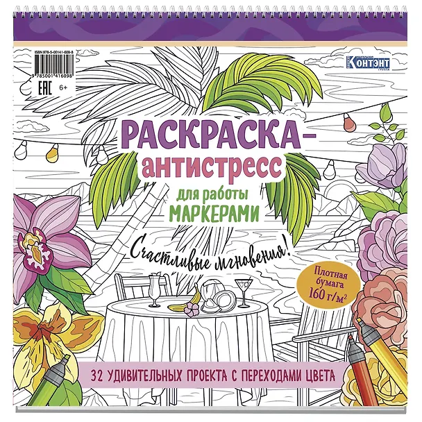 Раскраска-антистресс для работы маркерами (обложка с пальмой)