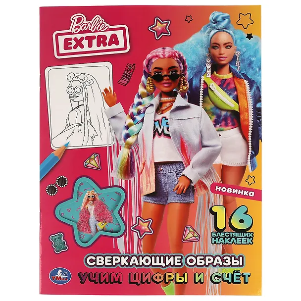 Раскраска. 16 сверкающих наклеек. Барби. Сверкающие образы. Учим цифры и счёт, ТМ «УМка»: