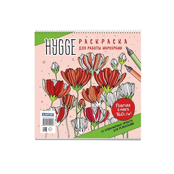 Раскраска Hygge для работы маркерами включает в себя 32 проекта для вдохновения, расслабления и творчества.