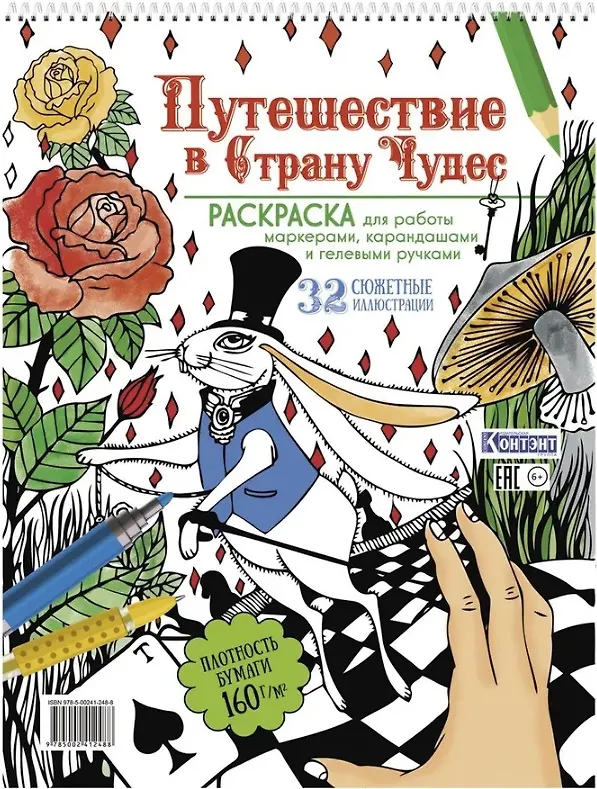 Раскраска по мотивам приключений Алисы в Стране Чудес перенесёт вас волшебный мир загадок и тайн. Издание включает в себя 32 удивительных проекта для работы маркерами, цветными карандашами и гелевыми ручками. Практичный формат, удобное скрепление на пружине, очень плотная бумага, атмосферные иллюстрации – отличный способ расслабиться и погрузиться в творчество в компании любимых героев. Следуйте за Белым кроликом и раскрашивайте с удовольствием!