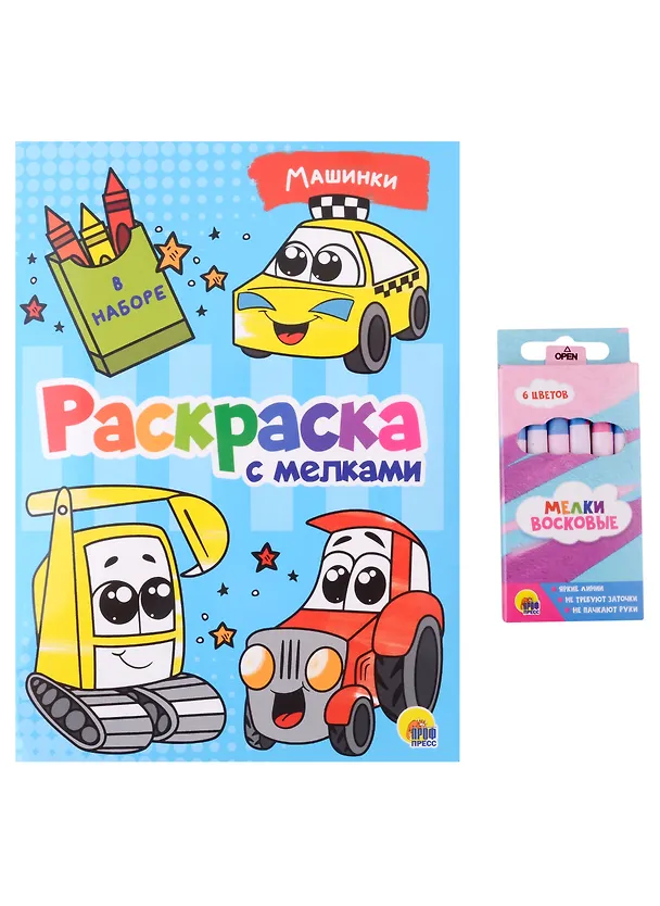 Серия раскрасок с восковыми мелками. Каждая картинка – из крупных элементов и с толстым контуром: всё для удобства раскрашивания мелками!