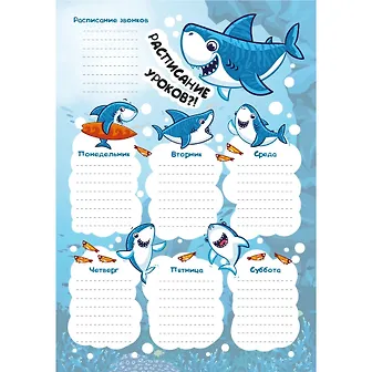Расписание уроков А4 "Веселые акулы" мел.картон, полноцв.печать, выб.УФ-лак