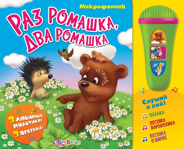 Ваш малыш любит петь? Подарите ему книжку с чудо-микрофончиком! Нажимая на кнопочки, ребёнок услышит 3 веселые песенки из популярных мультиков и сможет подпеть любимым героям. А мама прочитает малышу мультсказки: «Трям! Здравствуйте!», «Паровозик из Ромашково» и «Ну, погоди!».