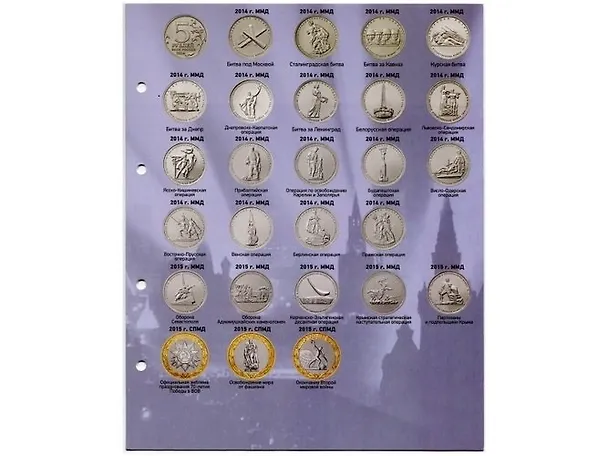 В комплект входит 1 разделитель с изображением монет, посвящённых 70 годовщине Великой Победы. Подходят для любого альбома формата Optima .