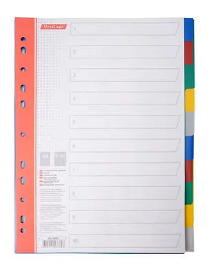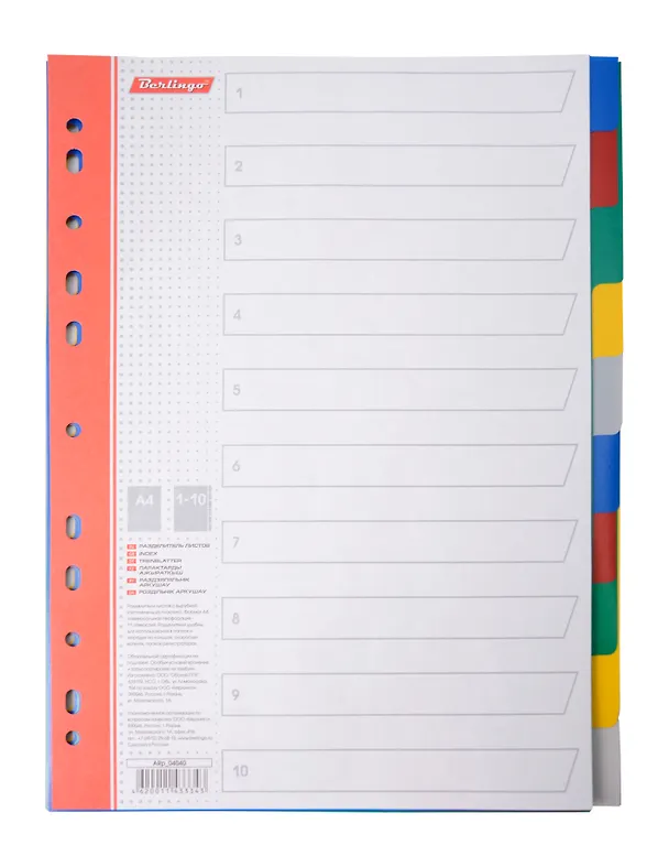 Набор цветовых разделителей. Формат А4. Обеспечивают сохранность и аккуратность листов. Удобны в использовании с папками-регистраторами и на кольцах.