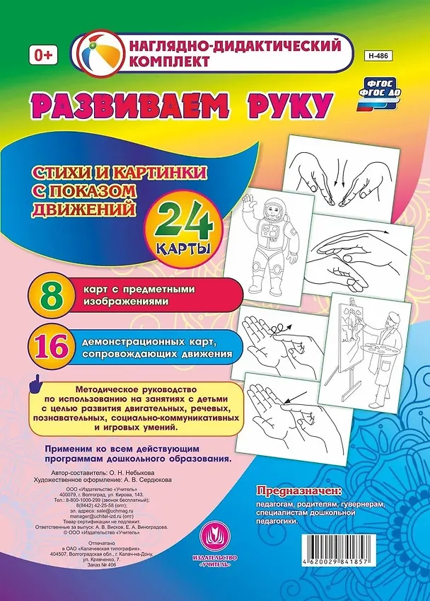 Наглядно-дидактический комплект с методическим сопровождением по его использованию предназначен для занятий с детьми старшего дошкольного и младшего школьного возраста и включает 8 карт с контурными предметными изображениями и 16 карт с показом движений, на основе которых педагог сможет в игровой, двигательной и продуктивной деятельности организовать образовательный процесс, направленный на развитие мелкой моторики рук и ознакомление с профессиями на занятиях познавательного цикла в соответствии с ФГОС.