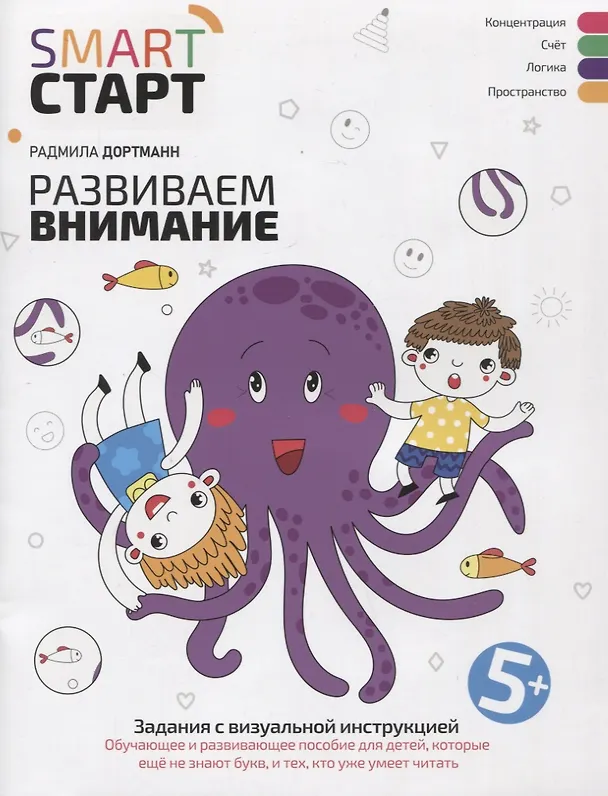 Каждая книга серии "Smart-старт" - это система заданий и упражнений, направленная на развитие конкретного познавательного навыка. Яркие и интересные задания серии "Smart-старт" разработаны с упором на визуальную инструкцию, что позволяет ребёнку легко (нативно) понимать и выполнять упражнения без участия взрослого.