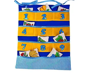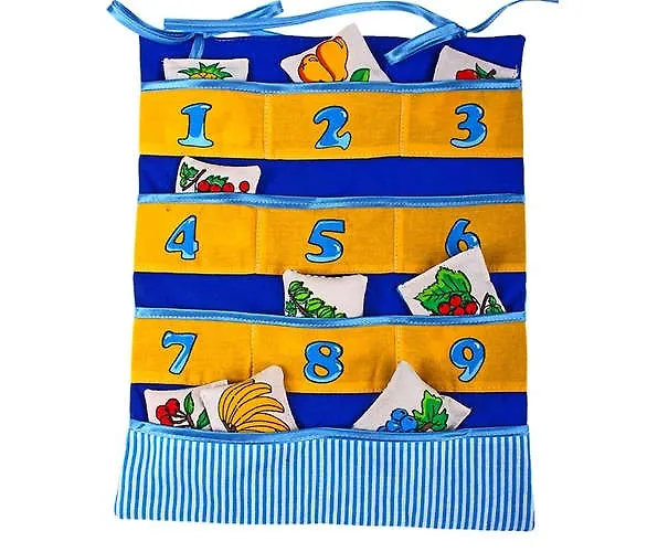 Развивающий игровой набор "Математическая касса" представляет собой текстильное полотно с кармашками , которое подвешивается и разноцветные карточки в виде мягких тканевых подушечек. На каждой карточке изображены ягоды в разных количествах, а на карманах - цифры. Малыш должен сообразить и вставить "карточку" а правильный карман. Также при помощи этой кассы ребенок познакомится с различными цветами и запомнит их.