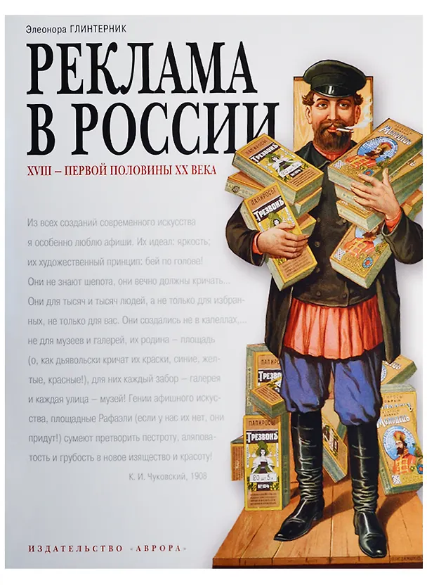Отечественному читателю предлагается первое историческое исследование российской рекламы - полноправной отрасли художественной культуры, активно развивавшейся и в дореволюционной России, и в СССР, однако ранее не подвергавшейся обобщенному анализу. Э. М. Глинтерник, доктор искусствоведения, профессор Санкт-Петербургского университета технологии и дизайна, на широком визуальном, документальном и литературном материале прослеживает основные этапы развития рекламного дела в России - от истоков, восходящих к гравюре и товарным клеймам Петровской эпохи, минуя расцвет лубочной культуры и торговой вывески, до золотого века советской рекламы и графического дизайна в 1920 - х годах, определявшего эво