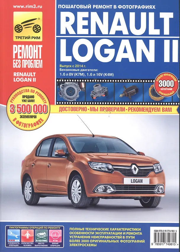 .Предлагаем вашему вниманию руководство по ремонту и эксплуатации автомобиля Renault Logan II выпуска с 2014 года с бензиновыми двигателями 1,6 л 8V (К7М) и 1,6 л 16V (К4М). В издании подробно рассмотрено устройство автомобиля, даны рекомендации по эксплуатации и ремонту. Специальный раздел посвящен неисправностям в пути, способам их диагностики и устранения.