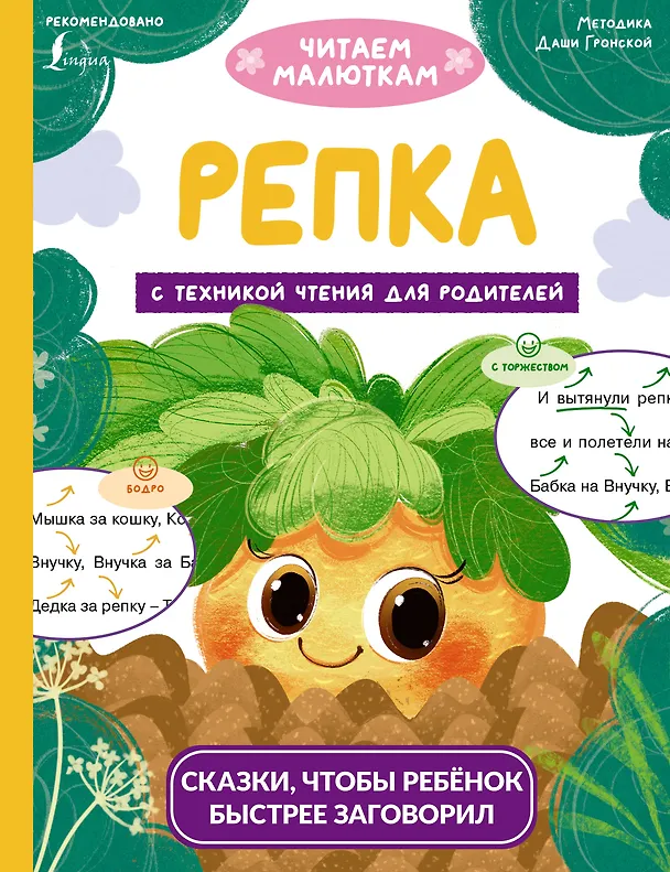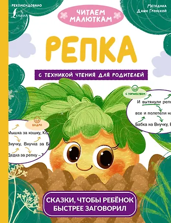 Хотите, чтобы ребенок наконец заговорил? Тогда читайте ему «Репку»! Эта книга – настоящий помощник для родителей. Небольшой объём сказки, простой и увлекательный сюжет – всё это делает сказку «Репка» подходящей книгой для первого чтения малышу. Здесь, кроме текста самой сказки, вы найдёте великолепные красочные иллюстрации, а также специальные обозначения, которые помогут читать так, чтобы у ребёнка в процессе слушания возник живой отклик. Ребенок реагирует на эмоциональное чтение сказки взрослым. Он заражается эмоциями и отражает их. У него быстрее возникнет потребность выразить себя и свои чувства. А это поможет ему быстрее заговорить! Вовлечённость ребёнка в процесс – ключевой момент в ег