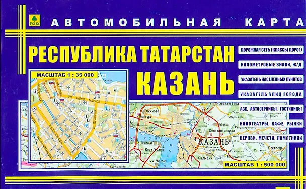 Катра Республики Татарстан и план города Казань . Дорожная сеть (классы дорог), километровые знаки, железные дороги, указатель населенных пунктов, АЗС, автосервисы, гостиницы, кинотеатры, кафе, рынки, церкви, мечети, памятники.