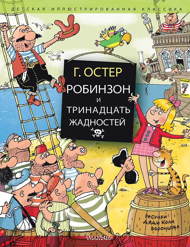 «Робизнзон и тринадцать жадностей» — весёлая и поучительная повесть Григория Остера. Жадности — это золотые монеты, но не простые, а заразные. Заражают они ураганной жадностью, которая передаётся при простом рукопожатии. На первый взгляд очумевшие от жадности больные выглядят очень смешно, но уже на второй становится понятно, насколько они опасны: одна фабрика ремней чего стоит! И со всем этим бороться предстоит очень юной, но очень мудрой госпоже президенту — девочке Синди.