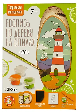 Роспись по дереву на спиле «Маяк» (косой спил) - набор, с помощью которого ребенок создаст красивую картину с изображением моря и маяка. Такую поделку можно подарить друзьям или близким, или украсить детскую комнату. Занятия росписью развивают мелкую моторику, художественный и эстетический вкус, тренируют внимательность и усидчивость. Состав набора: Березовый спил высота 22-24 см, шаблон рисунка, копировальная бумага, инструкция, 6 цветов красок, кисточка. Материалы: дерево, картон, акрил, полимерные материалы. Для детей старше 7 лет и взрослых.