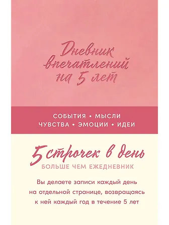 «Дневник впечатлений на 5 лет» создан для того, чтобы вы могли записывать что-то особенное о каждом дне. Хотите ли вы зафиксировать свои достижения, мысли, идеи или красоту момента, оставить на будущее важные размышления, заметить перемены и задуматься о главном — дневник идеально для этого подойдет.