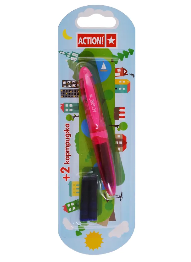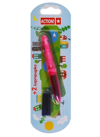 Детская перьевая ручка ACTION! с запасными картриджами отличается от взрослых ручек пузатым пластиковым корпусом, эргономичной зоной гриппа. В комплекте 3 чернильных картриджа: один в ручке и два запасных в блистерном отсеке.