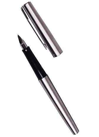 Перьевая ручка в тонком корпусе из полированной нержавеющей стали цвета хром. Два чернильных картриджа в комплекте.