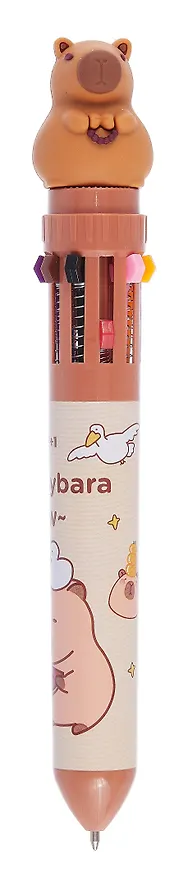 Ручка выглядит очень мило и радует капибарой на конце. Корпус толстоват и иногда ручкой неудобно писать и рука устает. Но все же ручка отличная! Целых десять цветов, которые всегда под рукой, удобно переключаются и создают организацию в тетрадях. Чернила пишут хорошо, не текут, не сохнут и не царапают бумагу.