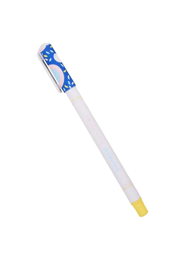 Корпус круглой формы в сечении. Вся ручка имеет мягкое покрытие, она гладкая, приятная для рук. Покрытие тонкое, очень нежное. Небольшой колпачок синего цвета с рисунком украшает эту ручку. Колпачок не хрупкий, с широким клипом, со сквозным отверстием.