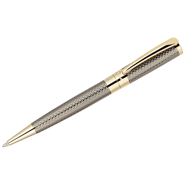 Delucci Allegro – это изысканная подарочная шариковая ручка с синими чернилами, которая подойдёт как коллеге, так и начальнику. Сочетание золотого цвета и цвета оружейного металла делают её необычной и интересной. Диаметр корпуса увеличивается к торцевой части и покрыт гравировкой в виде сеточки. Клип сделан из нержавеющей стали, он позволяет фиксировать ручку на ежедневниках, блокнотах и карманах одежды. Delucci Allegro оснащена поворотным механизмом, внутри которого расположен пишущий стержень диаметром 1 мм, который идеально подходит для быстрого стиля письма. Упакована в кожаный футляр.