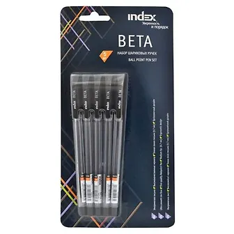 Ручка, шариковая, INDEX BETA, Набор, 5шт, прозрачный корпус, 0,7мм, черные, в блистере