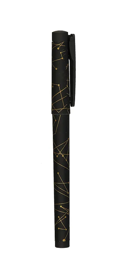 Купили ручку в подарок приятелю, чтобы дополнить подарок, в который входил ежедневник. Корпус ручки чёрный, с символами (созвездиями). Корпус бархатистый, но каких-либо "ляпов" На корпусе не остаётся. Выглядит стильно, пишет хорошо, чернила не мажут.