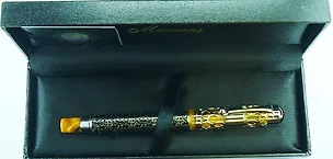Подарочная шариковая ручка выполнена в восточном стиле с неповторимым дизайном. Её корпус покрыт "серебряными кружевами", придающими ручке сказочный вид, который дополняет колпачок цвета золотого янтаря с отделкой, полностью сочетающейся с изящным кружевным корпусом. Пишущий узел: M (medium), 1 мм. Нержавеющая сталь. Цвет чернил: синий. Цвет корпуса: перламутровый янтарь. Материал корпуса, латунь, акриловая смола.