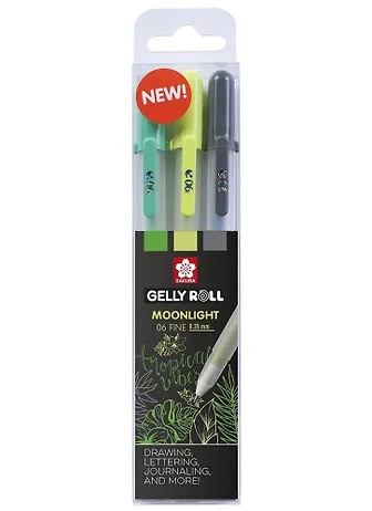 - В набор входят 3 гелевые ручки Sakura Gelly Roll Moonlight 06 с толщиной линии 0.3мм. Цвета: Fresh Green, Leaf Green, Cool Gray.