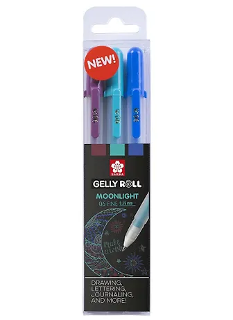- В набор входят 3 гелевые ручки Sakura Gelly Roll Moonlight 06 с толщиной линии 0.3мм. Цвета: Bordeaux, Blue Green, Ultramarine.
