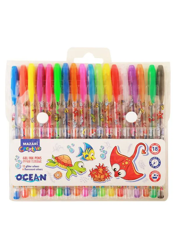 Набор ручек гелевых "OCEAN" от MAZARI, с ароматизированными чернилами, 18 цв., пулевидный пиш.узел 0.9мм, корпус пластиковый, цветной. Каждая ручка с индивидуальным колпачком,не будут пачкаться,засыхать и портиться. Ручки отлично подходят как для письма,так и для рисования и раскрашивания картинок. Толщина стержня средняя. Линии четкие,не текут и не смазываются . Данный набор прекрасно подойдет в качестве подарка или сувенира на любой праздник.