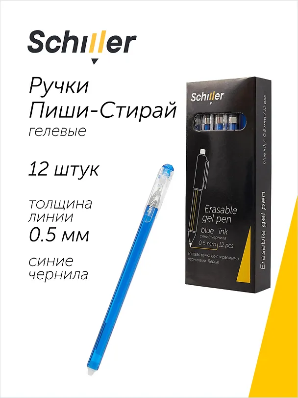 Ручки гелевые пиши-стирай синие 12 штук "Repeat" 0,5 мм, Schiller