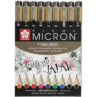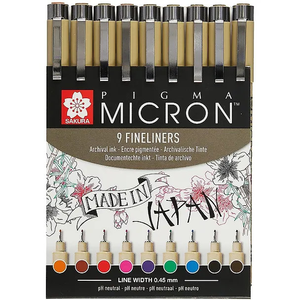 - В наборе 9 капиллярных ручек Sakura Pigma Micron 05 (пишущий узел 0,45мм), цвета: черный (Black), синий (Blue), красный (Red), зелёный (Green), коричневый (Brown), пурпурный (Purple), оранжевый (Orange), розовый (Rose), сепия (Sepia)