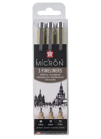 В ручках серии Pigma используются архивные чернила Pigma Ink: светостойкие (не выцветают), химически стабильные, на водной основе и пигментах. После высыхания устойчивы к воздействию воды (не расплываются при попадании на воды на бумагу), не пачкаются, не смазываются и не проступают на оборотную сторону листа (для большинства видов бумаги)