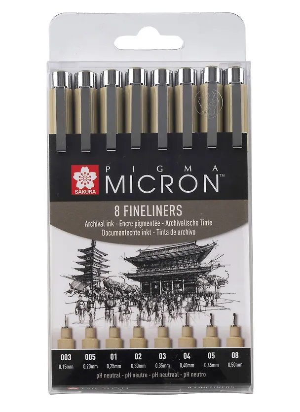 В наборе 8 черных линеров Sakura Pigma Micron: 003 (0.15мм), 005 (0.2мм), 01 (0.25мм), 02 (0.3мм), 03 (0.35мм), 04 (0.4мм), 05 (0.45мм), 08 (0.5мм).