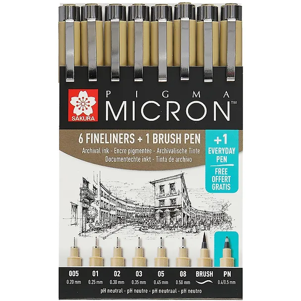 6 чёрных ручек Pigma Micron: 005 (0.2мм), 01 (0.25мм), 02 (0.3мм), 03 (0.35мм), 05 (0.45мм), 08 (0.5мм)