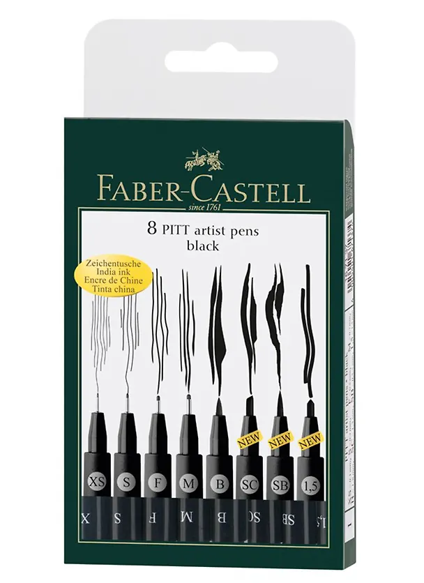 Капиллярные ручки в наборе Faber-Castell Pitt Artist Pen имеют в своём составе пигментированные и светостойкие чернила чёрного цвета, которые не просвечиваются через бумагу. Светостойкие чернила с высоким содержанием пигмента отлично подходят для творческих работ. Кнопочный механизм у изделий отсутствует, однако есть пластиковый прочный колпачок в цвет корпуса ручки. Так стержень будет защищён от поломки, а личные вещи не испачкаются о чернила. Чернила в наборе не имеют запаха и рН нейтральны. Длинный пишущий узел позволяет чертить с использованием трафаретов и линеек. Набор состоит из 8 ручек с различными наконечниками.