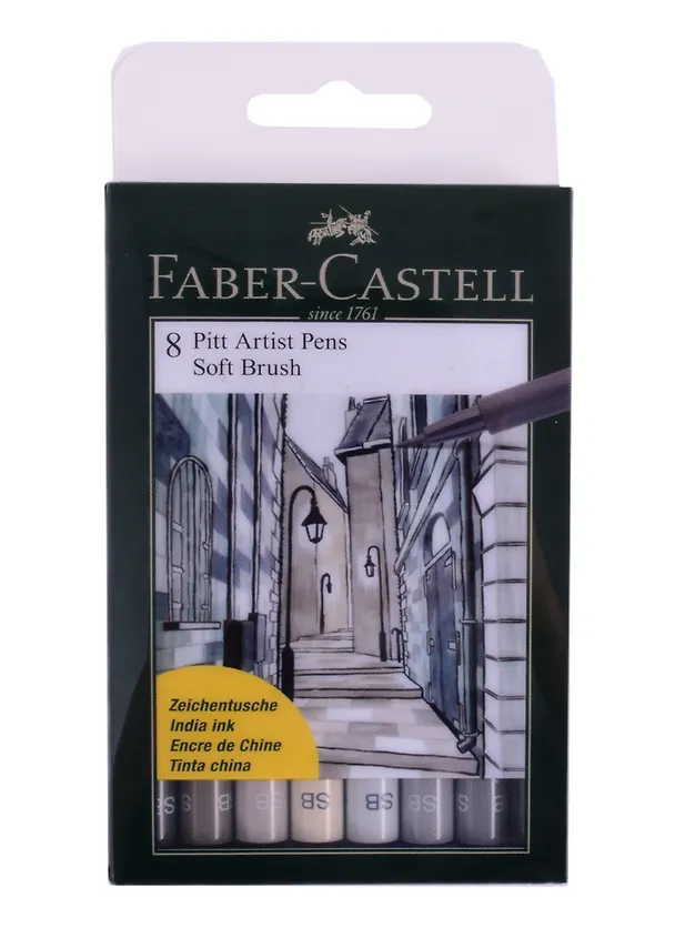 Брашпены с мягким наконечником Pitt Artist Pen Soft Brush от немецкого производителя Faber-Castell имеют в своём составе пигментированные и светостойкие чернила цвета, которые идеально подходят для создания рисунков, макетов, дизайна одежды и иллюстраций. Изделия обладают гибким наконечником в виде кисти, который сохраняет форму даже после длительного использования. Кнопочный механизм у изделий отсутствует, однако есть пластиковый прочный колпачок. Так стержень будет защищён от поломки, а личные вещи не испачкаются о чернила. Чернила в наборе не имеют запаха, рН нейтральны и не просвечиваются через бумагу. Набор состоит из 8 брашпенов серых оттенков: холодный серый I, холодный серый III, хол
