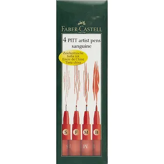 Капиллярные ручки PITT от Faber-Castell созданы для тех, кто любит делать зарисовки "на ходу": в поезде, машине, при прогулке по городу, во время мероприятий и лекций. Ими удобно писать, корпус ручки не скользит в руках. Они также отлично подойдут для создания комиксов. Набор из четырех ручек позволит создать контур, линии различной толщины, закрасить необходимые области и наложить тени. Чернила в ручках PITT светоустойчивы и не выцветают. Цвет набора: сангина.