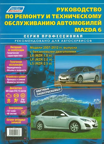 В руководстве дается пошаговое описание процедур по эксплуатации, ремонту и техническому обслуживанию автомобилей Mazda 6 2007-2012 годов выпуска, оборудованных бензиновыми двигателями L8 (MZR 1,8 л), LF (MZR 2,0 л) и L5 (MZR 2,5 л). Рассмотрены модели российского и европейского рынков. Издание содержит руководство по эксплуатации, подробные сведения по техническому обслуживанию автомобиля, ремонту и регулировке элементов систем двигателя (в т.ч. систем впрыска топлива, изменения геометрии впускного коллектора, изменения фаз газораспределения, запуска и зарядки), рекомендации по регулировке и ремонту элементов 5-ти и 6-ти ступенчатых механических коробок переключения передач (МКПП), автомати