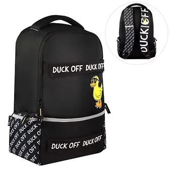 Вместительный и стильный рюкзачок, который полностью "облеплен", даже на лямках, словосочетанием "duck off", что, конечно же, является игрой словой от довольно грубого перевода "заткни варежку". Если вам (или вашему ребёнку) нравится быть в центре внимания, то рюкзачок отлично подойдёт. В него так же много чего может вместиться. Цена кусачая, но качество хорошее, рюкзак, вероятно, прослужит дольше обычных