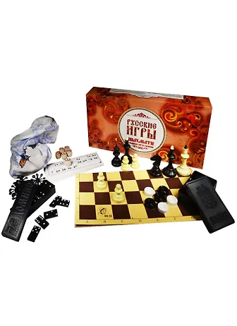 Это набор, включающий 4 популярные настольные игры: шашки, лото, шахматы и домино. В красочной коробке со стилизованными русскими узорами находятся: шахматная доска размером 40х40 см, шахматные фигуры, фишки для шашек, коробочка с костями для игры в домино, мешок с бочонками и 24 карточки для лото.