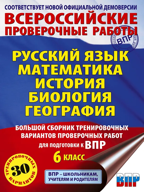 Пособие содержит 30 тренировочных вариантов проверочных работ по РУССКОМУ ЯЗЫКУ, МАТЕМАТИКЕ, ИСТОРИИ, ОБЩЕСТВОЗНАНИЮ, ФИЗИКЕ, БИОЛОГИИ, ГЕОГРАФИИ И АНГЛИЙСКОМУ ЯЗЫКУ — предметам, по которым пишут ВПР в 6 классе на всей территории страны.