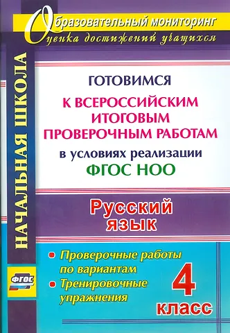 В условиях реализации ФГОС НОО. Проверочные работы по вариантам. Тренировочные упражнения. Всероссийская итоговая проверочная работа, которую напишут четвероклассники, будет включать задания по русскому языку. Практика системы подготовки к проведению такой формы оценки качества образования отвечает требованиям ФГОС НОО и предполагает формирование диагностического ресурса, который позволит школьникам привыкнуть к экзаменам, попробовать свои возможности в регулярном выполнении контрольных работ, оценить уровень реальных знаний и умений, отследить успехи и неудачи. В пособии представлены примерные итоговые проверочные работы по русскому языку и тренировочные упражнения, составленные с учетом ти